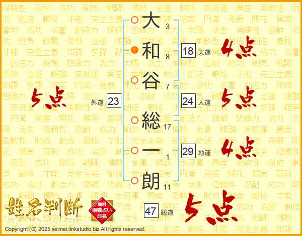 大(3画)和(8画)谷(7画) 総(17画)一(1画)朗(11画)