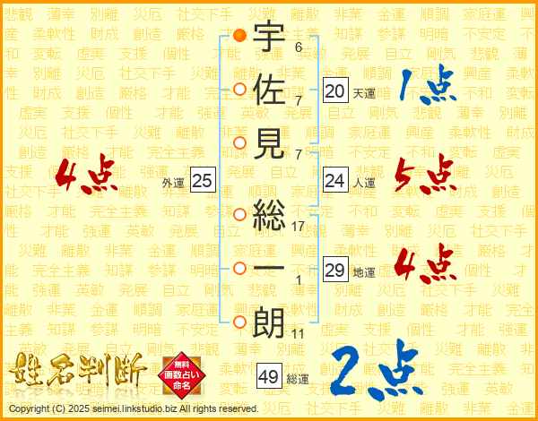 宇(6画)佐(7画)見(7画) 総(17画)一(1画)朗(11画)