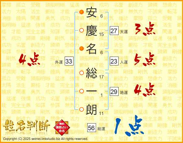 安(6画)慶(15画)名(6画) 総(17画)一(1画)朗(11画)