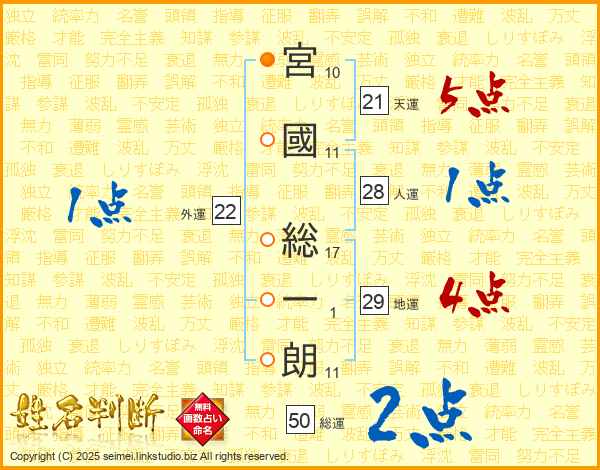 宮(10画)國(11画) 総(17画)一(1画)朗(11画)