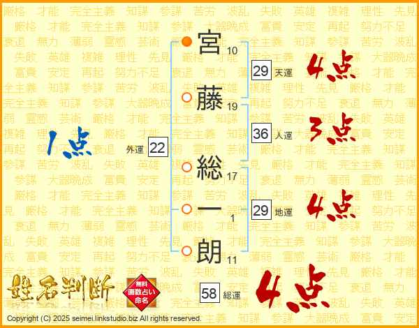 宮(10画)藤(19画) 総(17画)一(1画)朗(11画)