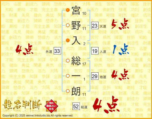宮(10画)野(11画)入(2画) 総(17画)一(1画)朗(11画)