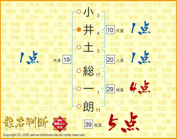 小(3画)井(4画)土(3画) 総(17画)一(1画)朗(11画)
