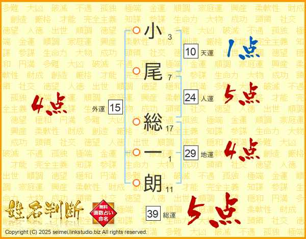 小(3画)尾(7画) 総(17画)一(1画)朗(11画)