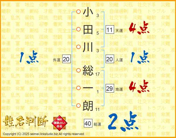 小(3画)田(5画)川(3画) 総(17画)一(1画)朗(11画)