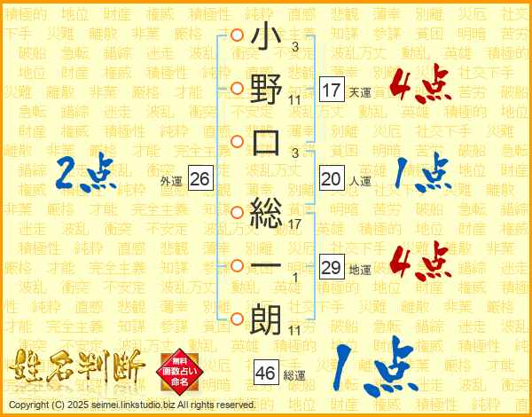 小(3画)野(11画)口(3画) 総(17画)一(1画)朗(11画)