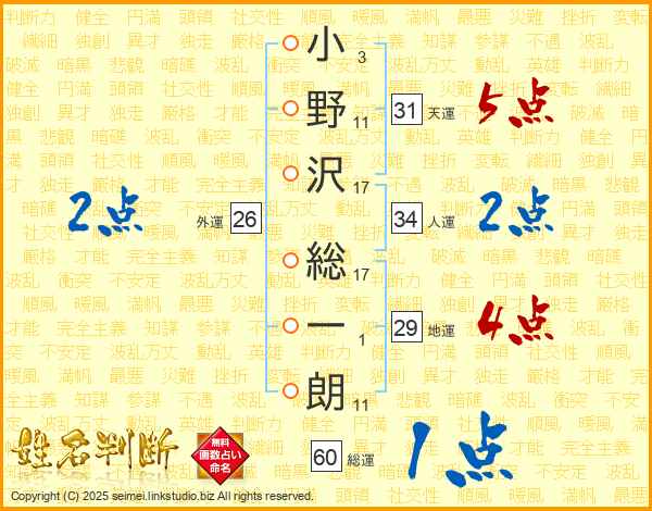 小(3画)野(11画)沢(17画) 総(17画)一(1画)朗(11画)