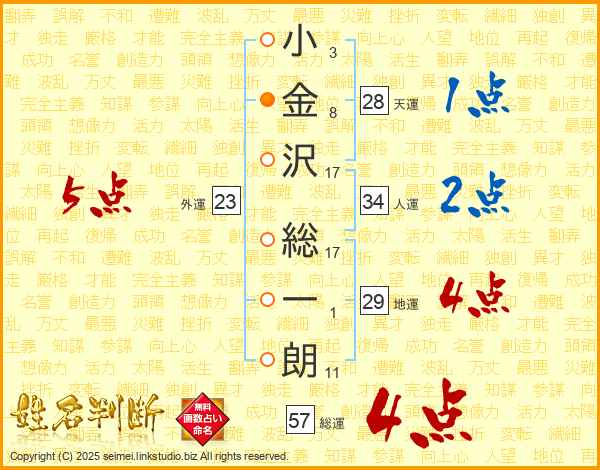 小(3画)金(8画)沢(17画) 総(17画)一(1画)朗(11画)