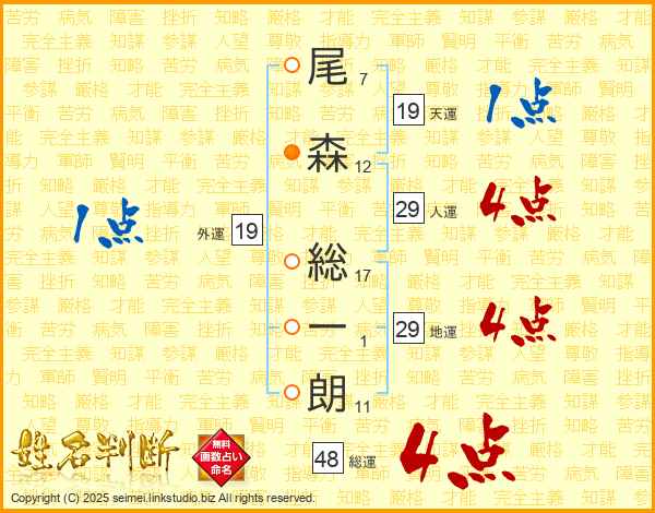 尾(7画)森(12画) 総(17画)一(1画)朗(11画)