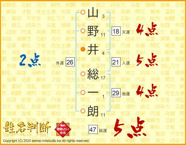 山(3画)野(11画)井(4画) 総(17画)一(1画)朗(11画)