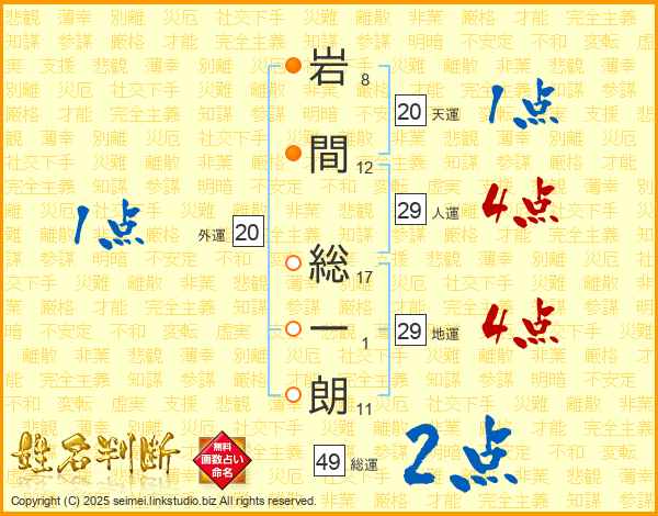 岩(8画)間(12画) 総(17画)一(1画)朗(11画)