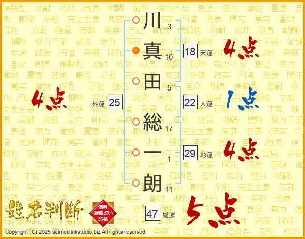川(3画)真(10画)田(5画) 総(17画)一(1画)朗(11画)
