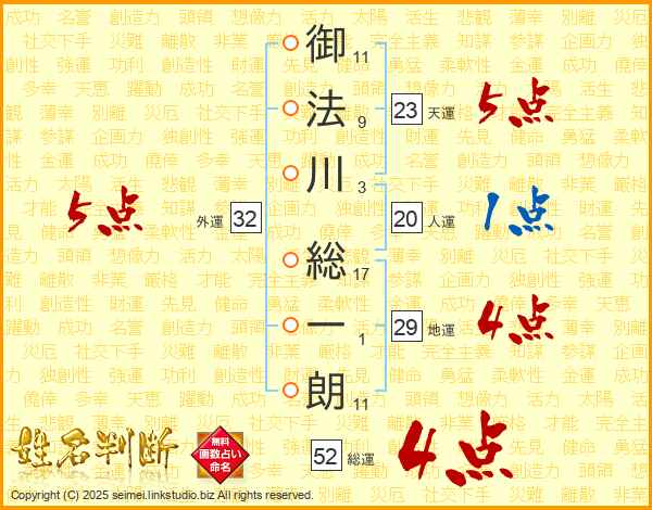 御(11画)法(9画)川(3画) 総(17画)一(1画)朗(11画)
