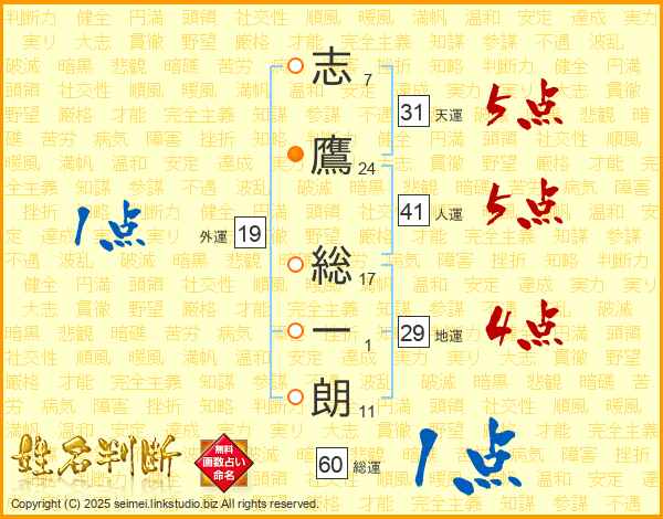志(7画)鷹(24画) 総(17画)一(1画)朗(11画)