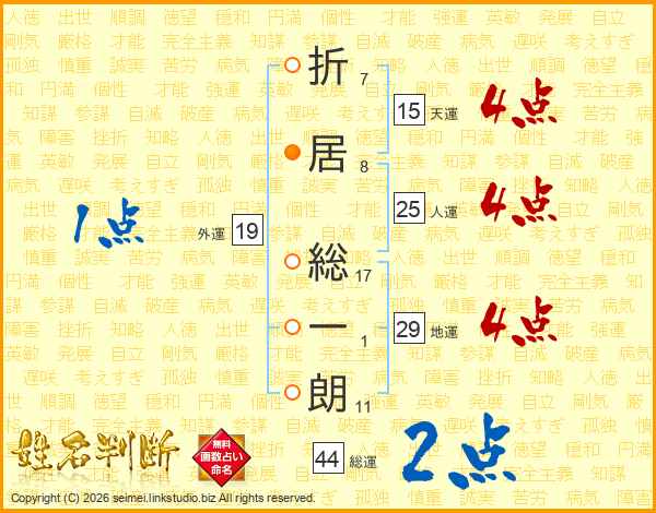 折(7画)居(8画) 総(17画)一(1画)朗(11画)