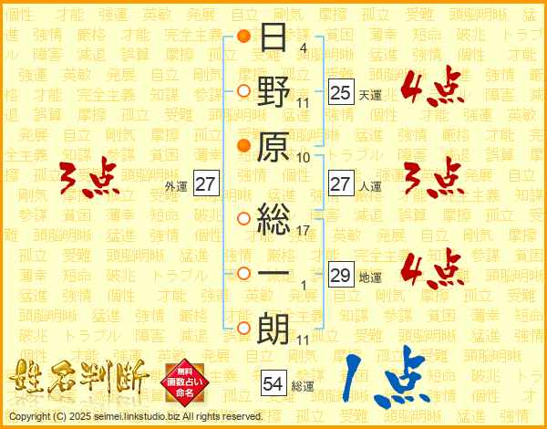 日(4画)野(11画)原(10画) 総(17画)一(1画)朗(11画)