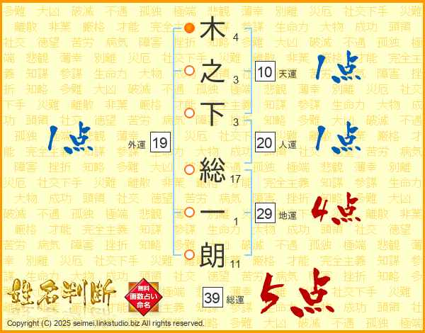 木(4画)之(3画)下(3画) 総(17画)一(1画)朗(11画)