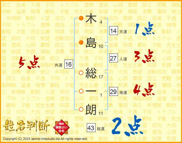 木(4画)島(10画) 総(17画)一(1画)朗(11画)