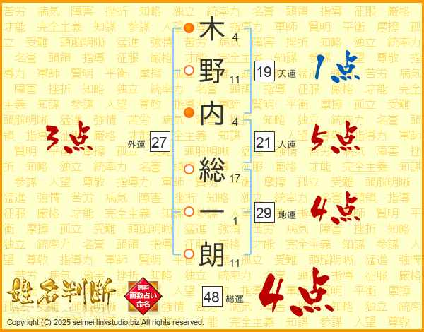 木(4画)野(11画)内(4画) 総(17画)一(1画)朗(11画)