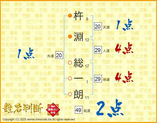 杵(8画)淵(12画) 総(17画)一(1画)朗(11画)