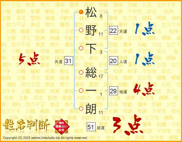 松(8画)野(11画)下(3画) 総(17画)一(1画)朗(11画)