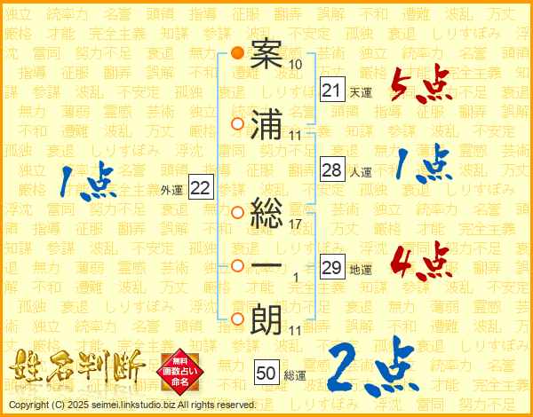 案(10画)浦(11画) 総(17画)一(1画)朗(11画)