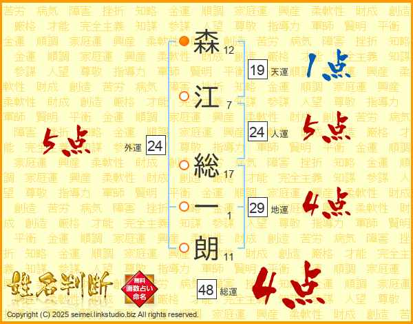 森(12画)江(7画) 総(17画)一(1画)朗(11画)