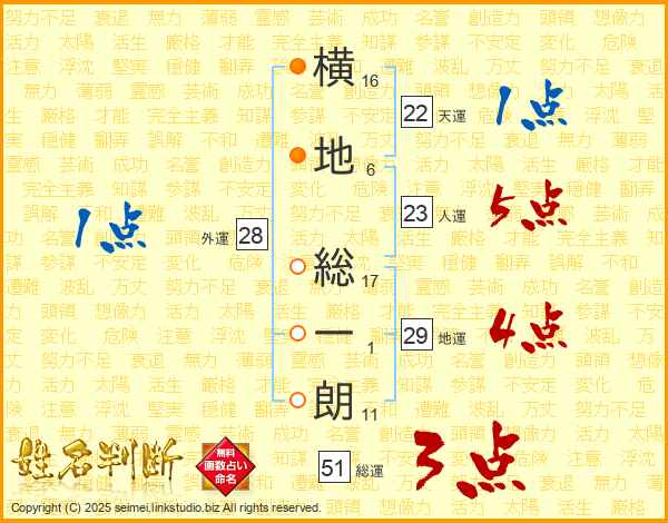 横(16画)地(6画) 総(17画)一(1画)朗(11画)