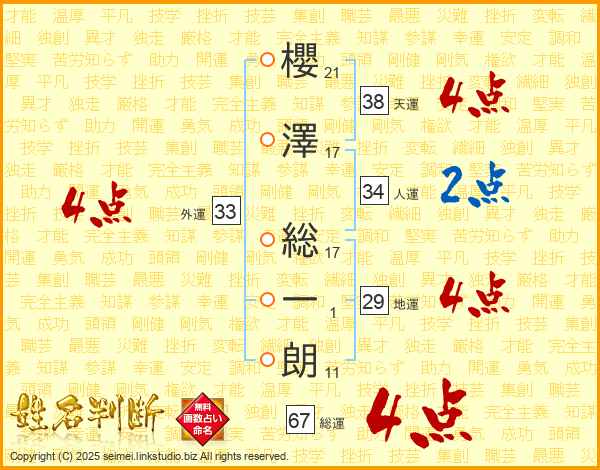 櫻澤総一朗さんの総運は67画の4点!