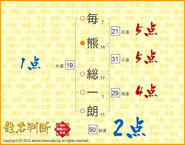 毎(7画)熊(14画) 総(17画)一(1画)朗(11画)