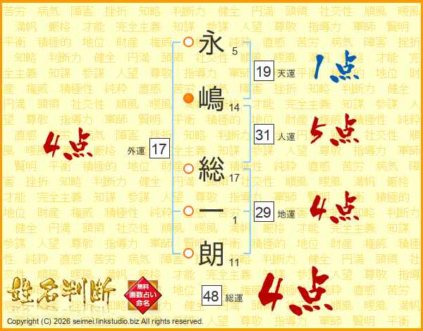 永(5画)嶋(14画) 総(17画)一(1画)朗(11画)