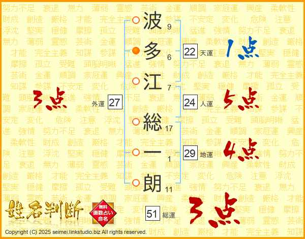 波(9画)多(6画)江(7画) 総(17画)一(1画)朗(11画)