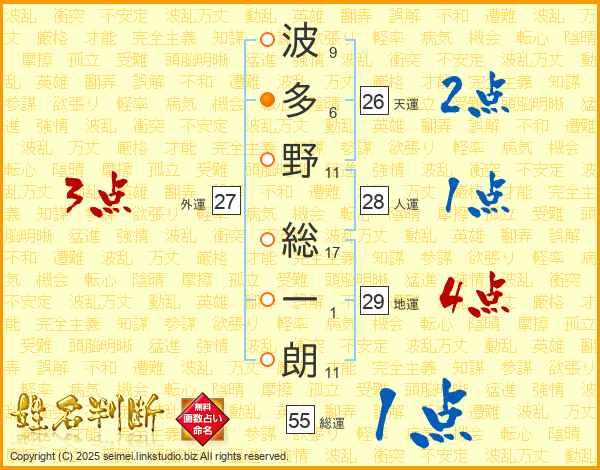 波(9画)多(6画)野(11画) 総(17画)一(1画)朗(11画)