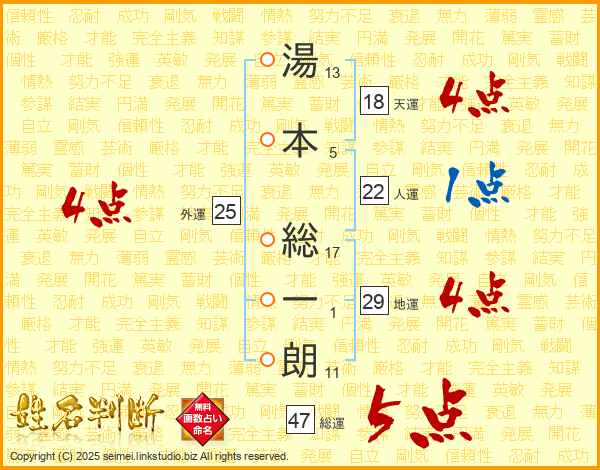 湯(13画)本(5画) 総(17画)一(1画)朗(11画)