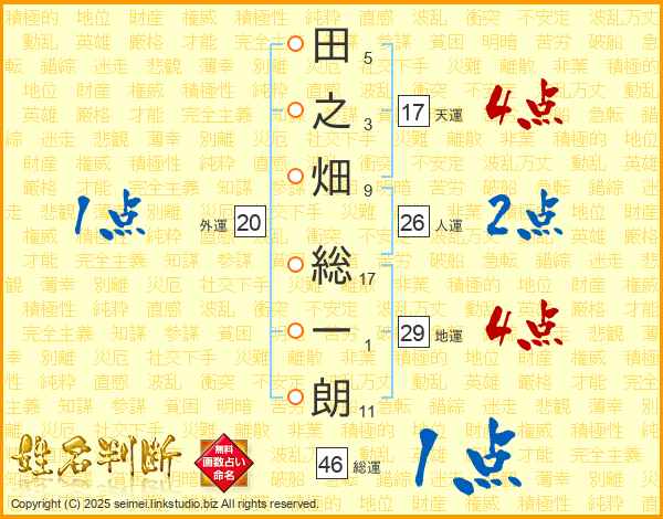 田(5画)之(3画)畑(9画) 総(17画)一(1画)朗(11画)