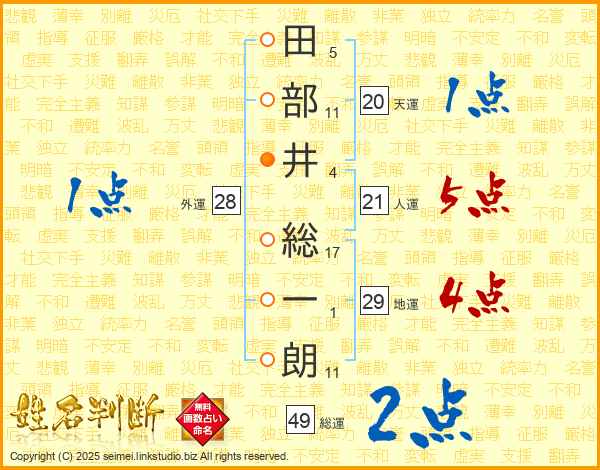 田(5画)部(11画)井(4画) 総(17画)一(1画)朗(11画)