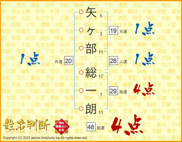 矢(5画)ヶ(3画)部(11画) 総(17画)一(1画)朗(11画)
