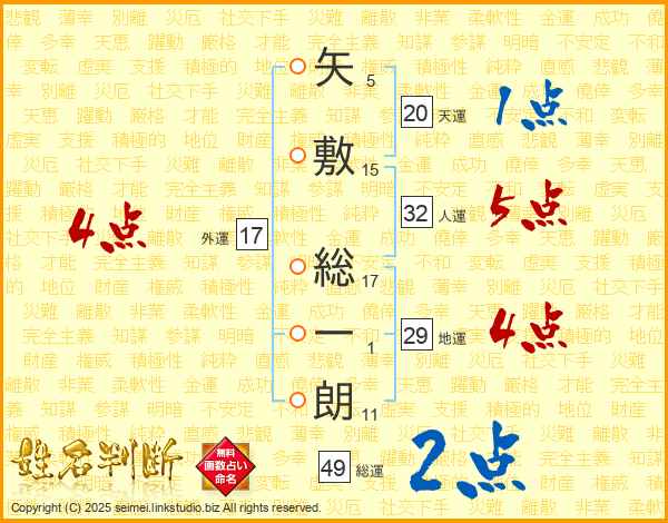 矢(5画)敷(15画) 総(17画)一(1画)朗(11画)