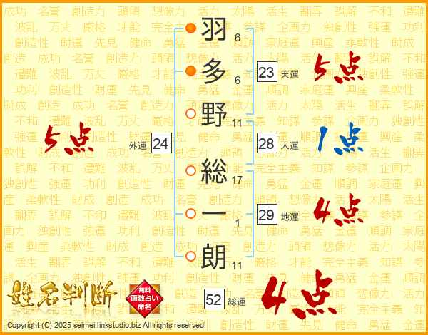 羽多野総一朗さんの総運は52画の4点!