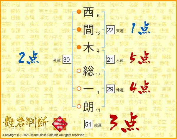 西(6画)間(12画)木(4画) 総(17画)一(1画)朗(11画)