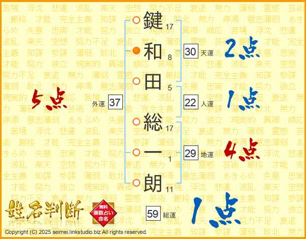 鍵(17画)和(8画)田(5画) 総(17画)一(1画)朗(11画)