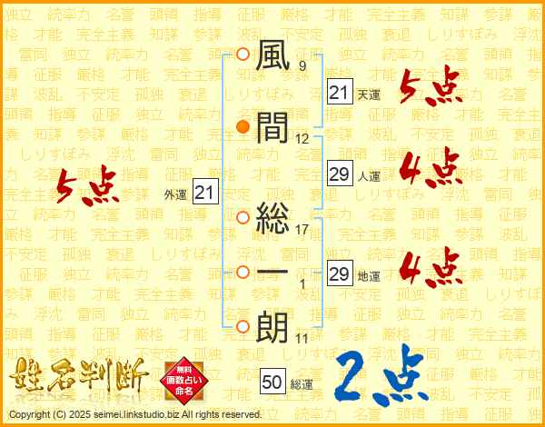 風(9画)間(12画) 総(17画)一(1画)朗(11画)