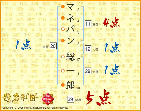 マ(2画)ネ(4画)パ(3画)ン(2画) 総(17画)一(1画)郎(10画)