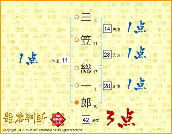 三(3画)笠(11画) 総(17画)一(1画)郎(10画)