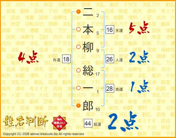 二本柳総一郎さんの総運は44画の2点!
