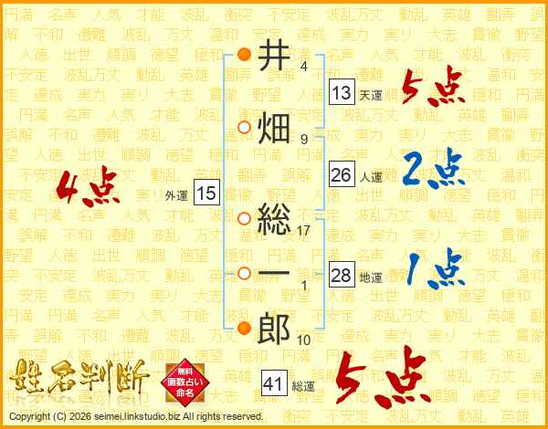 井(4画)畑(9画) 総(17画)一(1画)郎(10画)