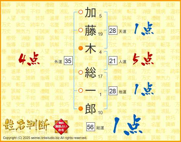 加(5画)藤(19画)木(4画) 総(17画)一(1画)郎(10画)