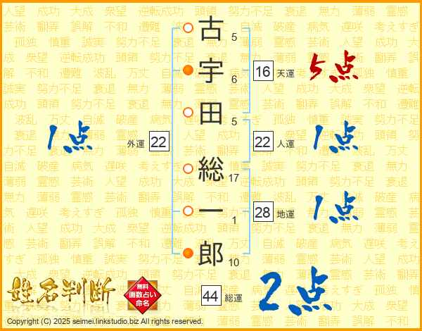 古(5画)宇(6画)田(5画) 総(17画)一(1画)郎(10画)