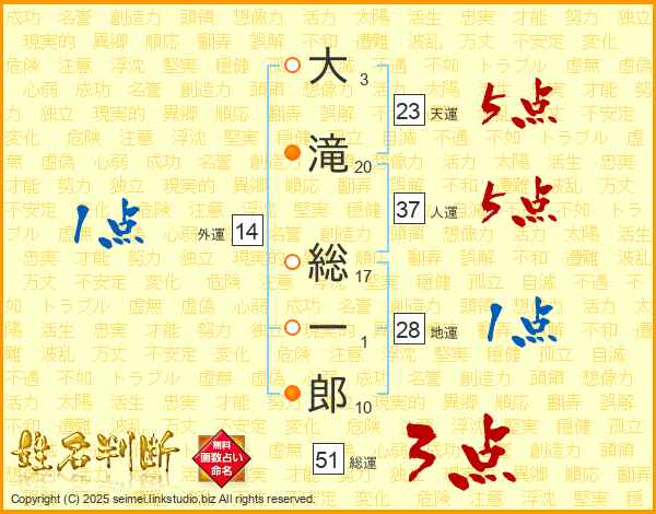 大(3画)滝(20画) 総(17画)一(1画)郎(10画)
