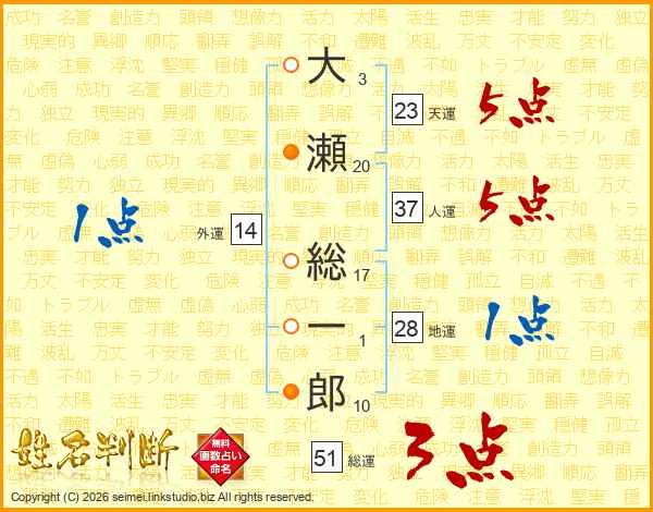 大(3画)瀬(20画) 総(17画)一(1画)郎(10画)